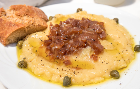 Not fava beans β this is a silky yellow split pea puree, often topped with olive oil, lemon, and capers.